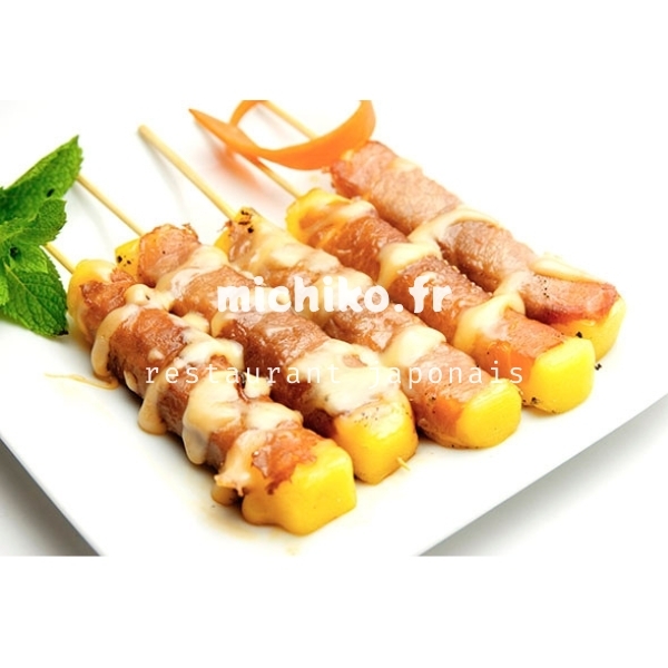 4 brochettes: 2 bœuf au fromage fondu, 2 saumon